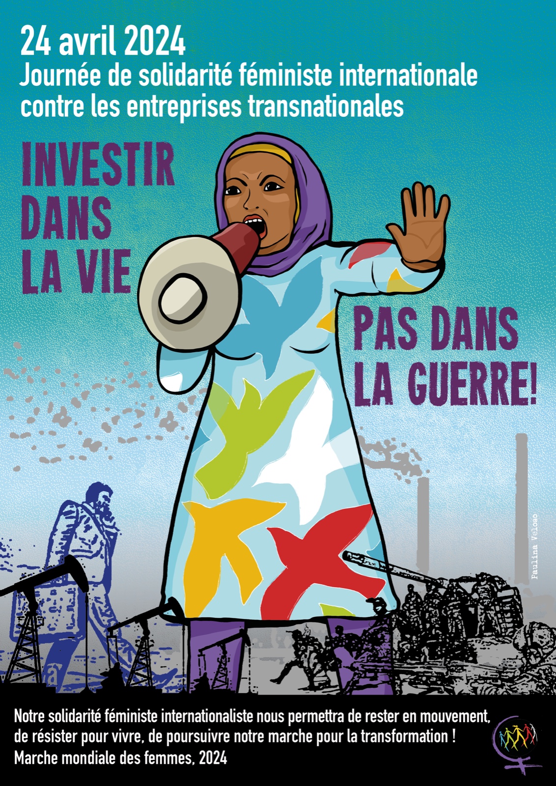 C'est la raison pour laquelle, en tant que Marche Mondiale des Femmes, nous continuerons de dénoncer le rôle des entreprises transnationales dans la poursuite des conflits et de la militarisation et la manipulation des politiques gouvernementales à cette fin, ainsi que les gouvernements et les entreprises transnationales qui profitent économiquement des conflits (contrôle des ressources naturelles - pétrole, eau, minéraux, entre autres) sur leur propre territoire ou d’autres.