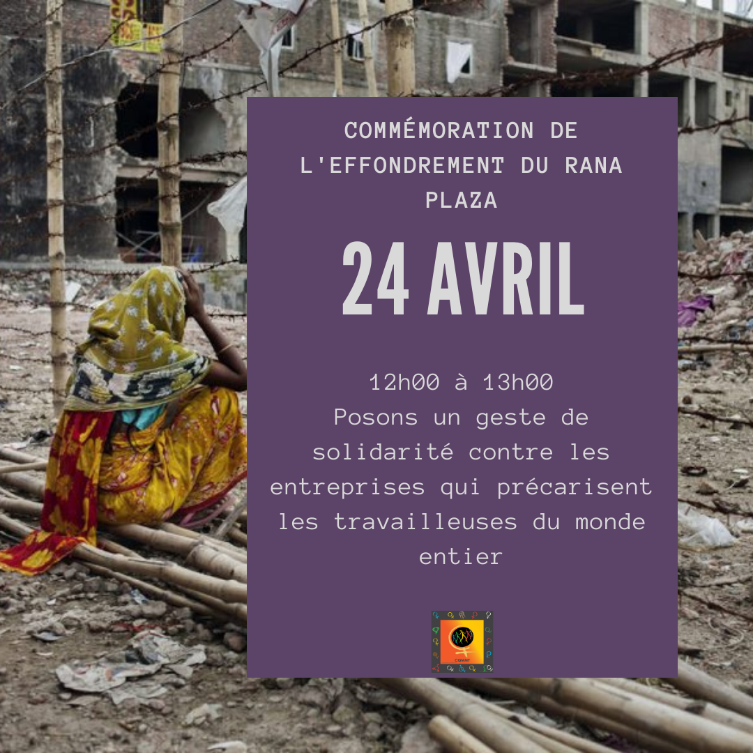 Le 24 avril 2013, l’effondrement de l’usine Rana Plaza au Bangladesh, a tué au moins 1 132 personnes majoritairement des femmes et en a blessé plus de 2 500 autres. La tragédie a mis en évidence les conditions de travail lamentables de même que les conditions salariales déplorables dans l’industrie du textile. Depuis, la Marche mondiale des femmes commémore cette journée par un appel à la solidarité féministe contre les entreprises transnationales. L’objectif étant de dénoncer le conflit entre le capital et la vie et rappeler les conséquences concrètes sur le quotidien des femmes.