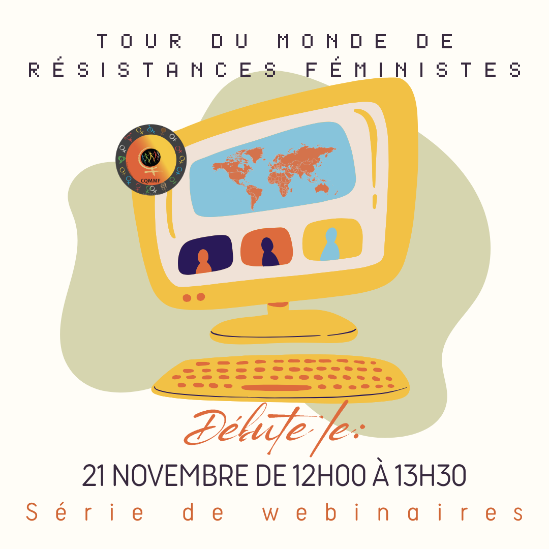 Du 21 novembre 2023 jusqu'à la fin de l'année 2024, nous invitons des militantes de la Marche mondiale des femmes des 5 régions du monde afin de nous partager les luttes et résistances qu'elles mènent en regard à différentes facettes essentielles à notre bien-vivre ensemble. Ces rencontres seront l'occasion de nous mettre en contact avec les thèmes clés de l'économie féministe.