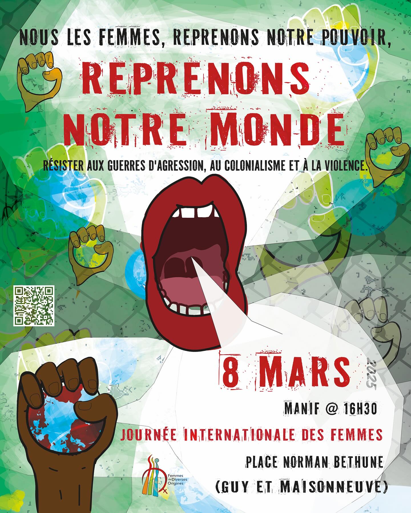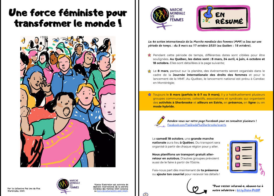 D'autres informations sont à venir, mais un lancement officiel est à prévoir le 11 mars 2025 en ligne. Les orientations et travaux de la Marche mondiale des femmes au Québec y sera présenté.