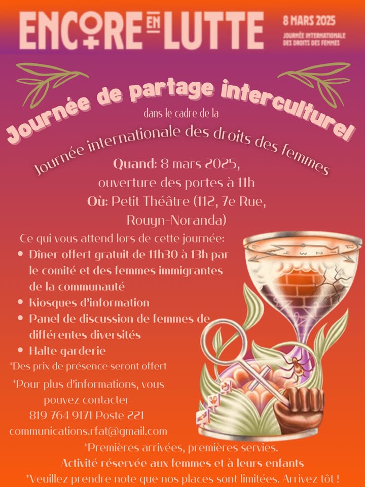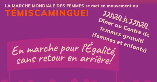- Le Centre de Femmes du Témiscamingue avec la Maison d'Hébergement l'Équinoxe et le CALACS du Témiscamingue invites les femmes et leurs enfants à participer à la création d'une banderole collective pour souligner le début des activités de la Marche Mondiale des Femmes 2025.