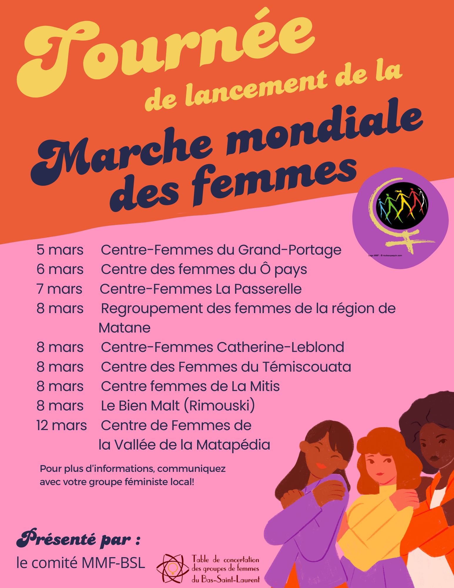 La Marche mondiale des femmes du Bas-Saint-Laurent sera présente dans le cadre des activités d'éducation, de sensibilisation, de militantisme et/ou festives de la journée internationale des droits des femmes partout au Bas Saint-Laurent pour vous livrer un slam à saveur féministe et lancer sa campagne de financement!