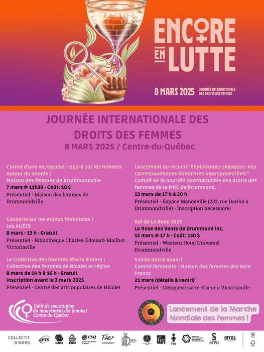 À l’occasion du 8 mars, les membres de la Table de concertation deu mouvement des femmes Centre-du-Québec vous invitent à participer à une série d’activités spéciales pour célébrer et défendre les droits des femmes.