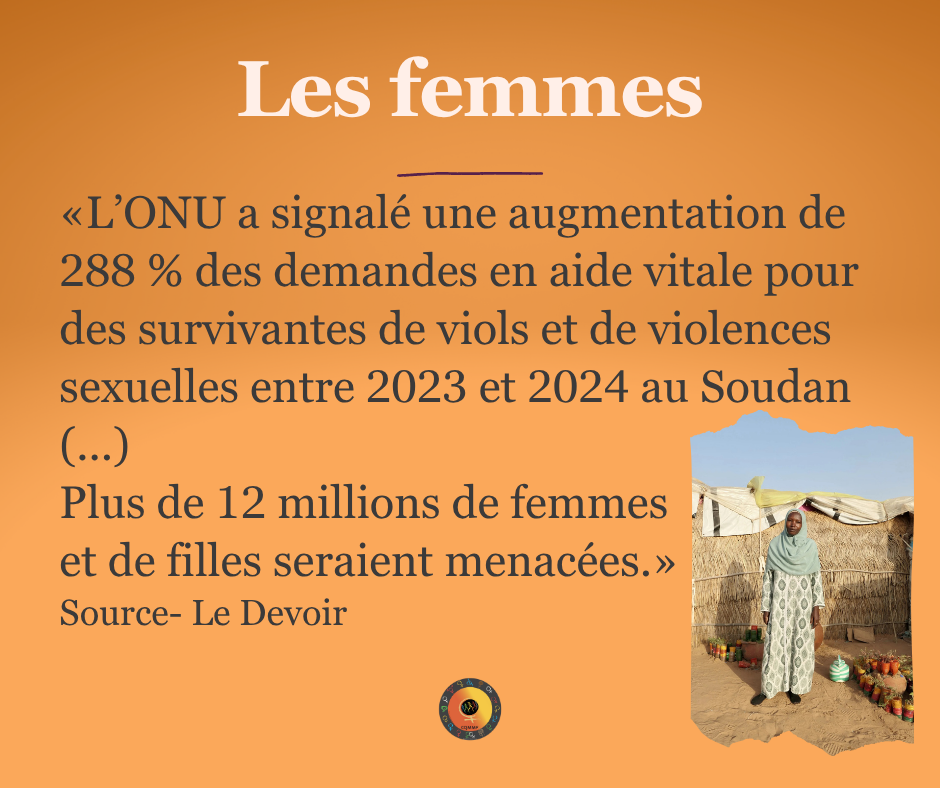 Les femmes et les filles sont particulièrement touchées par cette crise. Selon l’ONU, les demandes d’aide vitale pour les survivantes de viols et de violences sexuelles ont augmenté de 288 % entre 2023 et 2024. Plus de 12 millions de femmes et de filles sont aujourd’hui menacées. Les violences sexuelles sont utilisées comme de véritables armes de guerre, au même titre que les fusils ou les drones.