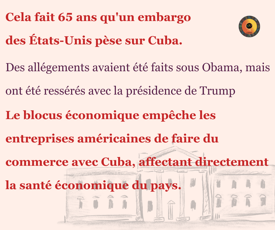 Depuis plus de 60 ans, un embargo imposé par les États-Unis pèse lourdement sur l’île, limitant drastiquement ses échanges économiques et fragilisant ses conditions de vie. Bien que certains allégements aient été amorcés par le passé, les sanctions ont été renforcées ces dernières années, accentuant la pression sur la population.