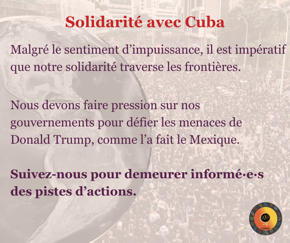 À Québec, une campagne propulsé par différents groupes et militantes invitant à faire un don directement sur la page du CAPMO en indiquant «Solidarité Cuba» - www.capmo.org
