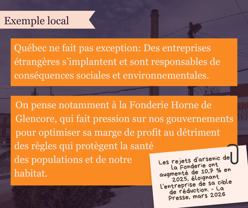 Pour l'édition 2026, nous publierons deux séries de vignettes sur deux secteurs importants: l'industrie minière et l'industrie numérique. Bien qu'il s'agisse de secteurs différents, on observe des similarités déplorables: entreprises étrangères, concentration des richesses, attaques à la démocratie, violation des droits humains et pollution de l’air, le sol et l’eau. La prochaine série de vignette sera publiée le 23 avril. Pour consulter notre matériel sur cette journée, nous vous invitons à visitez notre page consacrée à cet effet en cliquant sur le bouton ci-dessous.