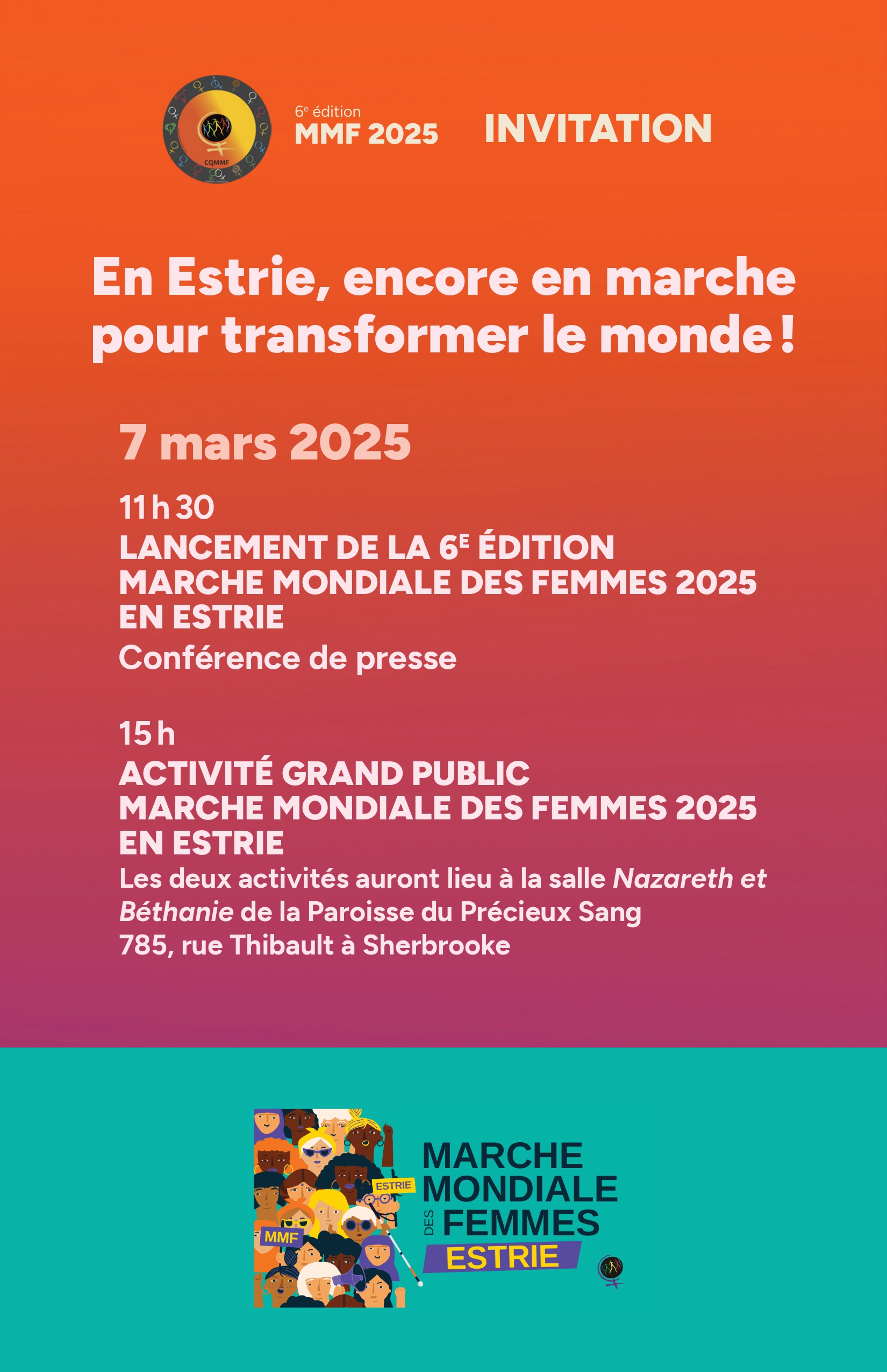 D'autres informations sont à venir, mais un lancement officiel est à prévoir le 11 mars 2025 en ligne. Les orientations et travaux de la Marche mondiale des femmes au Québec y sera présenté.
