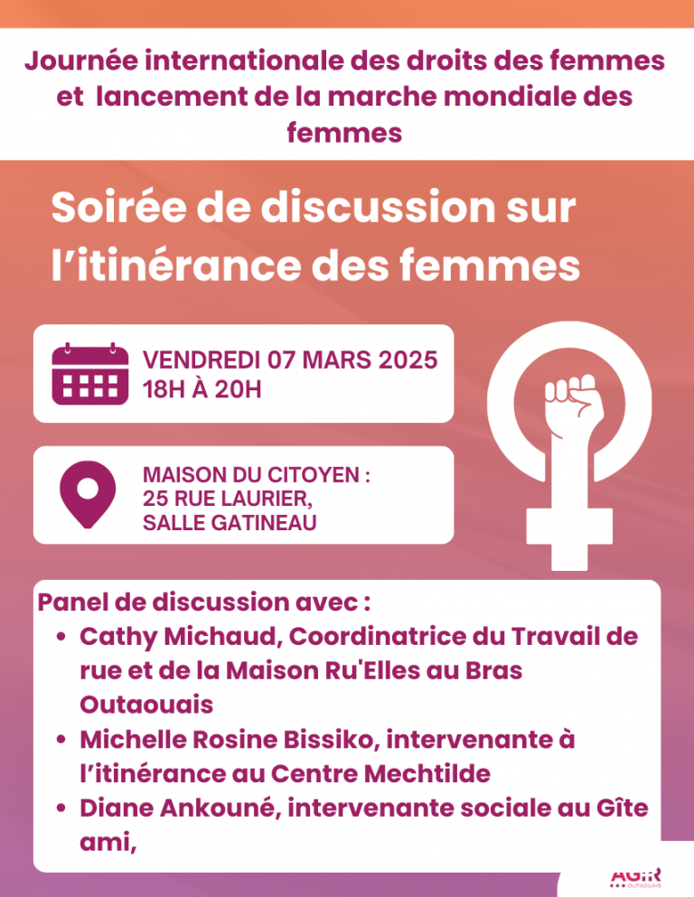Le groupe AGIR Outaouais organise une soirée de discussion sur l'itinérance des femmes le 7 mars.