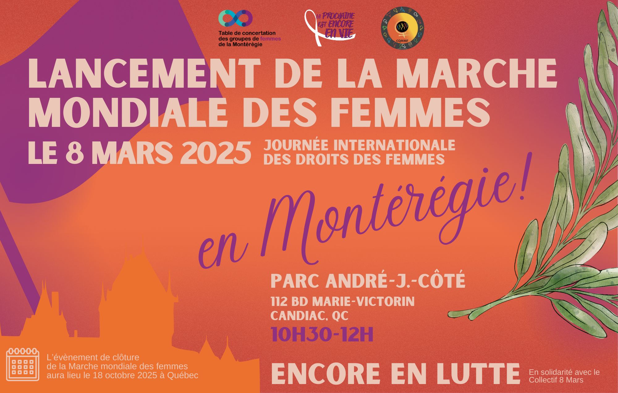 Le lancement national de la Marche mondiale des femmes (MMF) a eu lieu le 8 mars 2025 en Montérégie. L'événement a été organisé en collaboration entre la Coordination du Québec de la Marche mondiale des femmes (CQMMF) et la Table de concertation des groupes de femmes de la Montérégie (TCGFM). L'événement a réuni 500 personnes malgré le froid et l'éloignement du centre-ville.