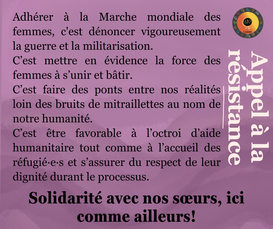 Adhérer à la Marche mondiale des femmes, c’est refuser la banalisation de ces violences. C’est reconnaître et soutenir la force des femmes qui s’unissent et résistent. C’est créer des ponts entre nos réalités, au-delà des frontières et des conflits, au nom d’une humanité commune.